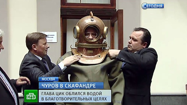 Обливание произошло в холле здания Центризбиркома. Чуров в огромных железных ботинках и в водолазном скафандре подошел к установленному там надувному бассейну, после чего на него вылили ведро с водой.
