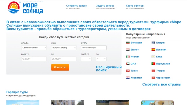 Из заявления турфирмы «Море солнца»: «В связи с невозможностью выполнения своих обязательств перед туристами турфирма „Море Солнца“ вынуждена объявить о приостановке своей деятельности. Всем туристам — просьба обращаться к туроператорам, указанным в договорах».