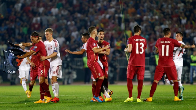 Напомним, в конце первого тайма встречи Сербия — Албания над полем появилась радиоуправляемая модель самолета, к которому был привязан баннер с изображением карты Великой Албании с присоединенной к ней территорией Косово. Защитник сербской сборной Стефан Митрович сорвал баннер, что разозлило футболистов албанской команды.На поле вспыхнула потасовка. В ней участвовали как представители сборных, так и болельщики, выбежавшие на газон. В результате матч, проходивший в Белграде, был остановлен.