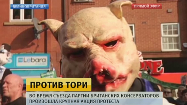 В британском Манчестере смешалось все люди, кони, собаки и даже свиньи. В городе прошла массовая акция против партии консерваторов. Тори впервые собрались на конференцию после переизбрания Дэвида Кэмерона на пост премьер-министра . Именно он стал основным объектом ненависти демонстрантов.