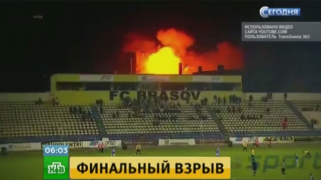 Футбольный матч в румынском городе Брашов прервал мощный взрыв. На этих кадрах видно, как оператор перевел камеру с поля на охваченное огнем здание пекарни. Она находится рядом со стадионом.