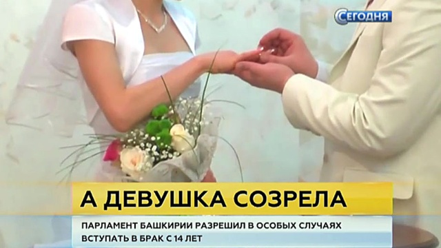 Проблемами семьи занимались сегодня в Башкирии. Там предложили узаконить ранние браки и разрешить жениться или выходить замуж с 14 лет. Такие поправки в республиканский семейный кодекс подготовили депутаты Курултая.