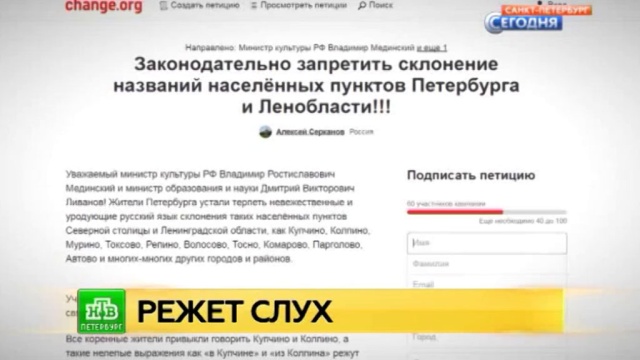 Петербуржец Алексей Серканов требует законодательно запретить склонение названий городских и областных населенных пунктов среднего рода. Речь идет о таких топонимах, как Купчино, Мурино, Колпино и других. Соответствующую петицию гражданин разместил на сайте change.org.