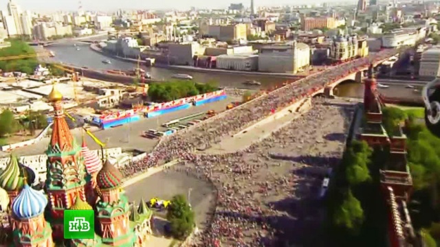На кадрах, снятых с высоты птичьего полета, видно, как бесконечный поток людей, полностью заполнив Тверскую улицу, движется в сторону Красной площади, пересекает ее и идет дальше.