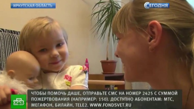 Как передает корреспондент НТВ Алексей Ивлиев, мама Алена, которая в одиночку растит двоих детей, сама такую сумму собрать не в состоянии. В Иркутске для маленькой Даши уже нашли 2,5 миллиона рублей. Благотворительный фонд помощи детям «Свет» просит зрителей НТВ помочь собрать недостающую сумму. Времени очень мало, а лечение в немецкой клинике — единственный шанс. Чтобы помочь Даше, отправьте СМС на номер 2425 с суммой пожертвования. Например: 150. Доступно абонентам МТС, «Мегафон», «Билайн» и Tele2.