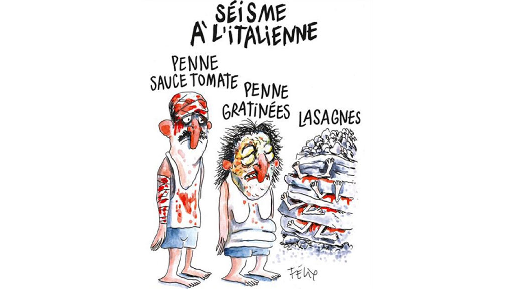 В Charlie Hebdo так прокомментировали тему разрушительного землетрясения: «Около 300 человек погибли при землетрясении в Италии. До сих пор неизвестно, прокричала ли земля перед тем, как сделать толчок, „Аллаху Акбар“».