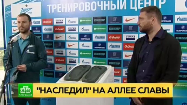 Знаменитый полузащитник и капитан «Зенита» «наследил» на Аллее славы. Алексей Игонин оставил отпечатки стоп для музея футбольного клуба.