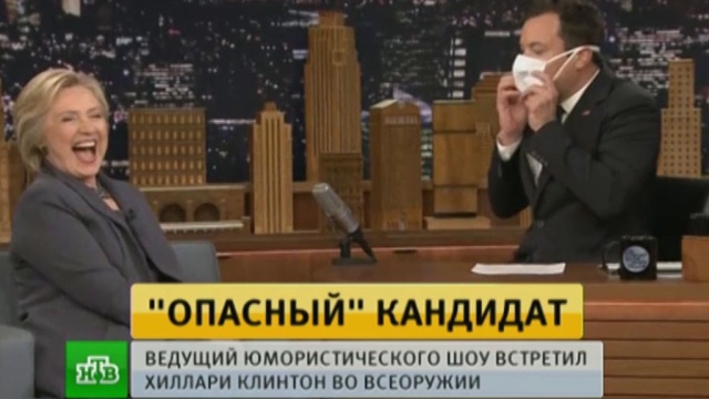 Ведущий американского канала NBC Джимми Фэллон надел медицинскую маску в эфире программы The Tonight Show с Хиллари Клинтон. Так он в шутку поприветствовал кандидата в президенты от Демократической партии, сообщает The Daily Mail.