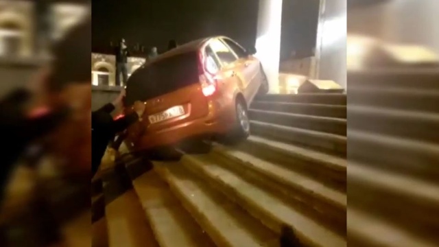 Но на этот раз ролик снят не в столице, где не утихают дорожные скандалы, а на Васильевском острове Петербурга. На кадрах легковой автомобиль пытается взобраться на ступени здания Биржи.