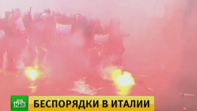 Большая группа агрессивно настроенных молодых людей, лица которых были скрыты под масками и капюшонами, попыталась прорваться в центр города, где в тот момент находился премьер Маттео Ренци.