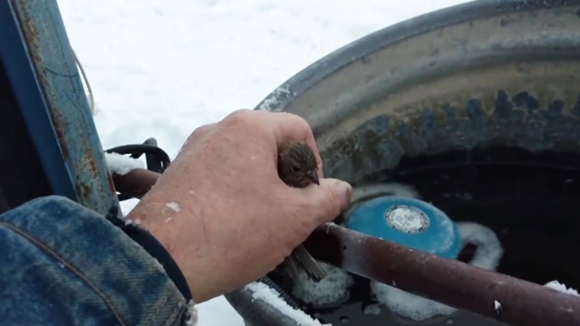 Фермер по имени Нельсон Уилсон нашел воробья примерзшим лапками к металлической трубе возле дома. Видимо, птица намочила их, а потом села на замерзший металл. Мужчина долго отогревал лапки птицы своим дыханием, после чего погрел их руками и отпустил пернатого пленника погоды на свободу.