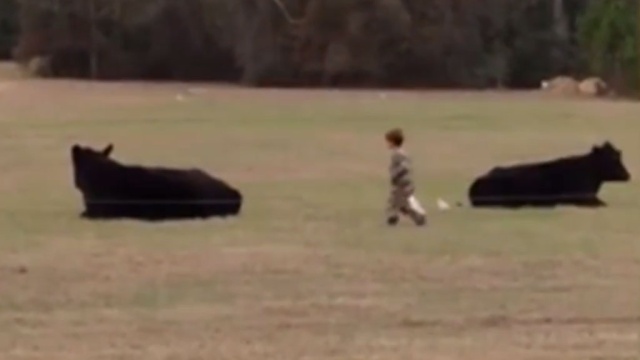 Скотт Кларк поспорил со своим маленьким сыном Ашером, что тот сможет подкрасться к быку и запрыгнуть ему на спину. Отец обещал малышу 20 долларов, если у него получится выполнить эту задумку.
