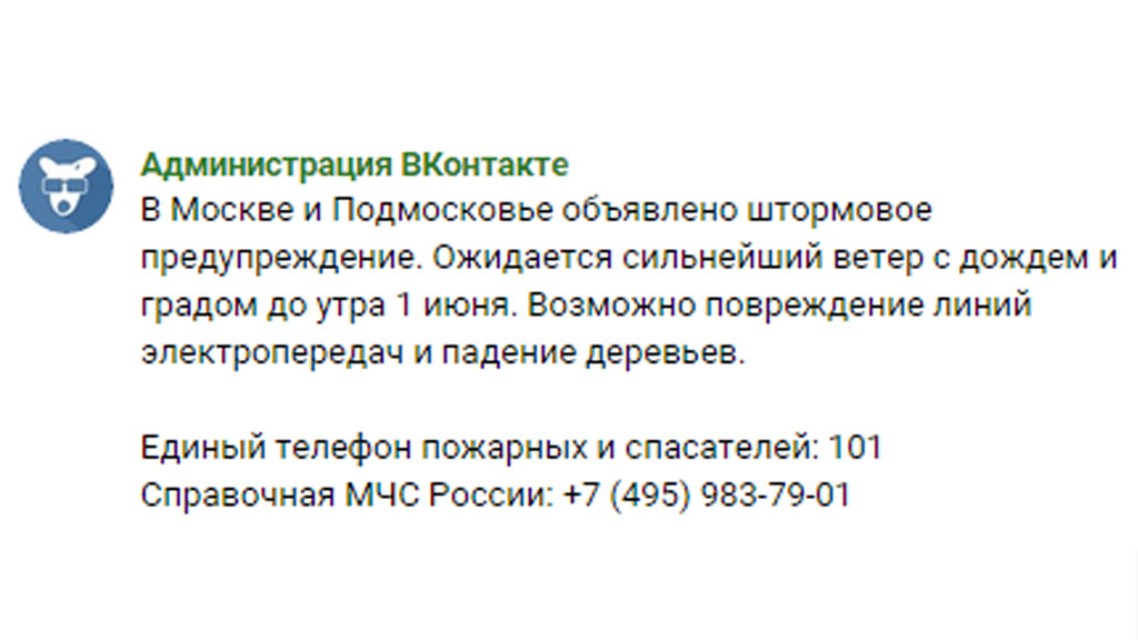 «ВКонтакте»: «В Москве и пригородах объявлено штормовое предупреждение. Сильный ветер с дождем и градом ожидается до утра 1 июня. Возможно повреждение линий электропередачи и падение деревьев».