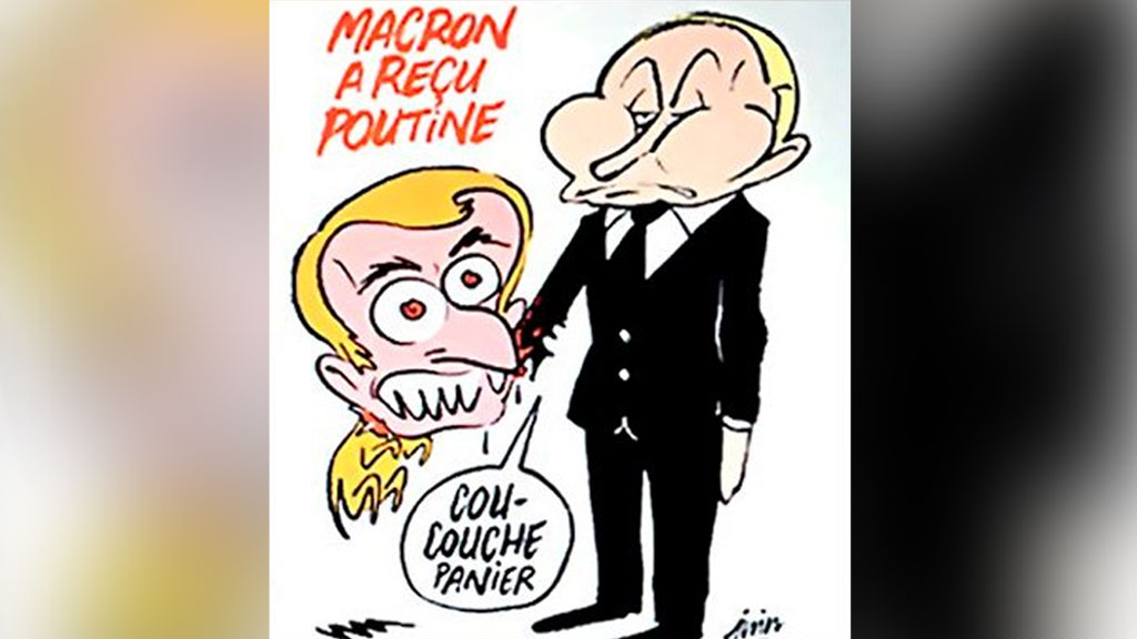 Карикатура по мотивам встречи двух лидеров в Версале появилась в последнем номере сатирического еженедельника. На рисунке с заголовком «Макрон принял Путина» изображен одетый в строгий костюм российский лидер, в руку которого вцепилась маленькая собачка с головой Макрона. Путин говорит красноглазому существу: «Лежать на месте».