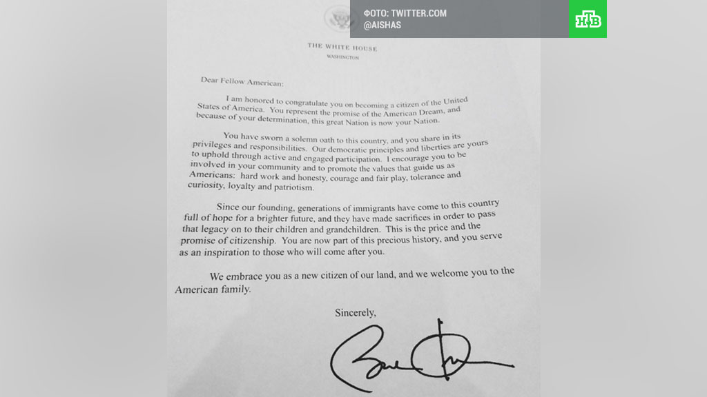 Приветственное письмо с подписью предыдущего главы Белого дома получил британец, принявший гражданство США. Об этом пишет газета The Independent со ссылкой на его супругу.