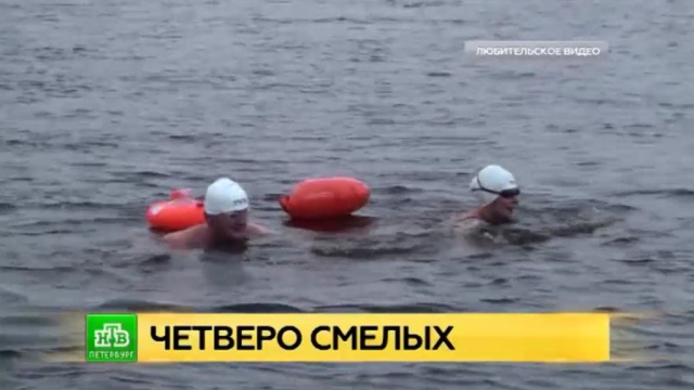 В акватории Невы и Финского залива проходит уникальная эстафета. Четверо спортсменов плывут из центра Петербурга в форт Константин. Что заставило их шагнуть в ледяную воду, не сообщается.