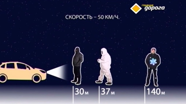 Пешехода в черном водитель увидит за 30 метров, в белом — за 37 метров, а человека с катафотом — с расстояния 140 метров. Другими словами, люди в черной и белой одежде почти невидимы. Стать заметнее пешеходам помогут светоотражатели. Они бывают белые, желтые или красные, эти цвета глаз хорошо воспринимает и легко отличает от фона.