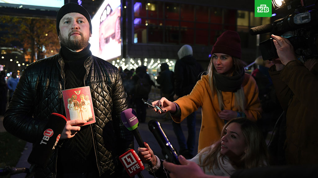 Рядом с московским кинотеатром и в самом здании сейчас усилены меры безопасности: журналистов на входе досматривают, территорию патрулирует полиция. За несколько часов правоохранители задержали за нарушение общественного порядка трех человек, в их числе проводившая одиночный пикет девушка с плакатом «Руки прочь от русского царя». Приглашенные на показ зрители сообщают о бродящем среди гостей мужчине с иконой и четками. От
