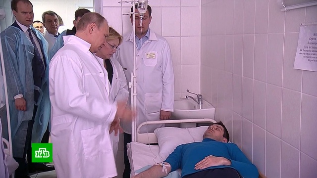 Владимир Путин посетил кемеровскую областную больницу скорой медицинской помощи, где встретился с пострадавшими при пожаре в торговом центре «Зимняя вишня».