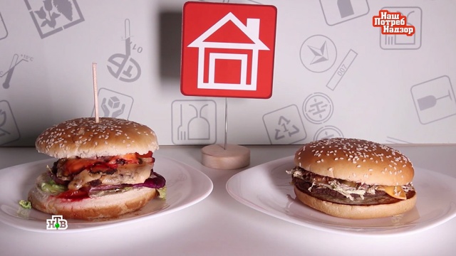Авторы программы «НашПотребНадзор» для сравнения купили несколько гамбургеров в очень популярной сети фастфуда и несколько приготовили на кухне сами из обычных магазинных продуктов. Начинка в них та же, что в покупных бургерах — томаты колечками в полсантиметра, сладкий красный лук и огурцы. Булка в основании бургера тоже покупная, зато на ней и срок годности указан, и состав расписан. Котлета из натуральной свежей говядины.