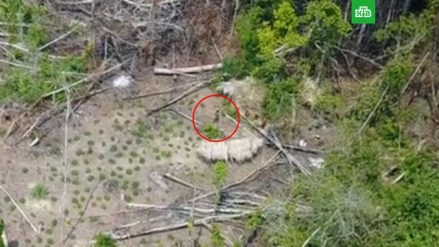 Видеозапись была сделана с помощью дрона. Камере удалось запечатлеть членов племени, ходящих по поляне с вырубленными деревьями.