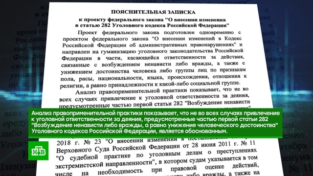 «Анализ правоприменительной практики показывает, что не во всех случаях привлечение к уголовной ответственности за деяния, предусмотренные ч. 1 ст. 282 „Возбуждение ненависти либо вражды, а равно унижение человеческого достоинства“ Уголовного кодекса РФ, является обоснованным», — говорится в пояснительной записке.