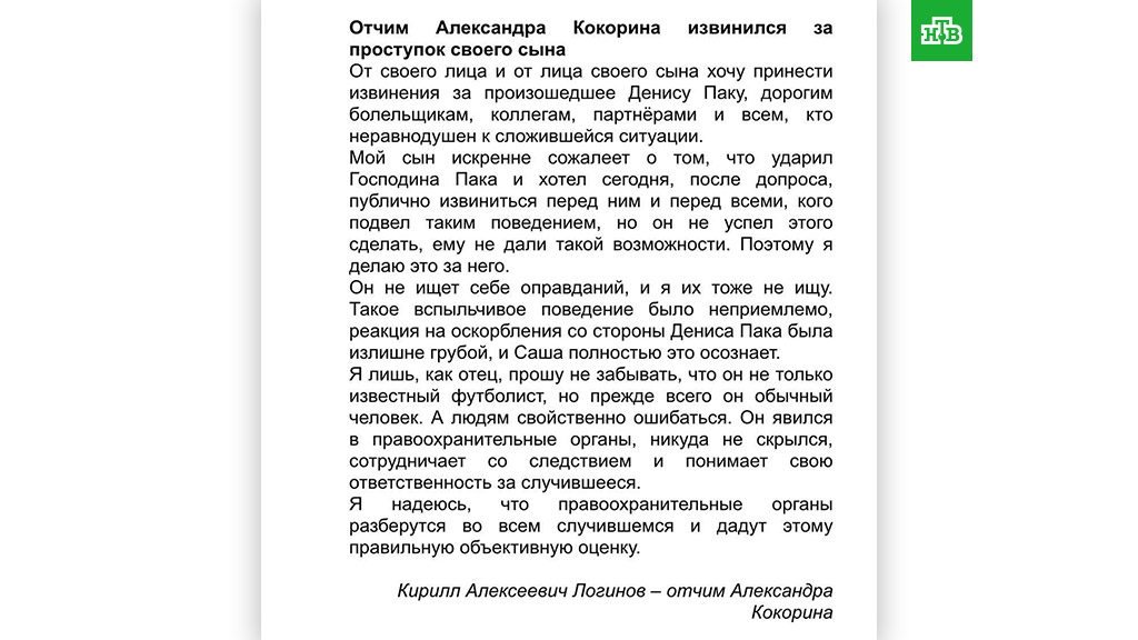 Заявление Логинова размещено на странице Александра Кокорина в Instagram: «От своего лица и от лица своего сына хочу принести извинения за произошедшее». Он попросил прощения у избитого чиновника Дениса Пака, болельщиков, коллег, партнеров и всех, кто неравнодушен к этой ситуации.