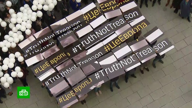В акции в российской столице приняли участие около 100 коллег Вышинского. Они подняли над головами панно с монохромным портретом Кирилла с хештегами #ЦеЕвропа и #TruthNotTreason, что переводится как «правда не измена». Надписи сделаны на черных полосах, символизирующие прутья клетки. Так организаторы акции обыгрывают своеобразную трактовку европейских ценностей на Украине, где журналистику приравнивают к государственной измене.