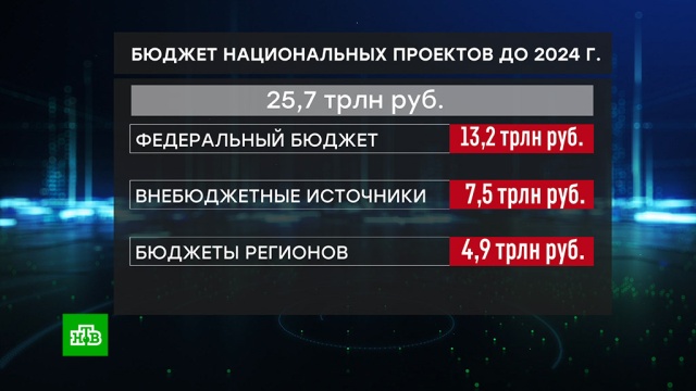 Согласно опубликованному на сайте правительства документу, на реализацию нацпроектов до 2024 года планируется потратить 25,7 трлн руб. Часть этой суммы — 13,1 трлн рублей выделят из федерального бюджета, еще 7,5 трлн рублей поступят из внебюджетных источников. Расходы регионов на нацпроекты составят 4,9 трлн рублей, еще 147,8 млрд рублей предоставят государственные внебюджетные фонды.