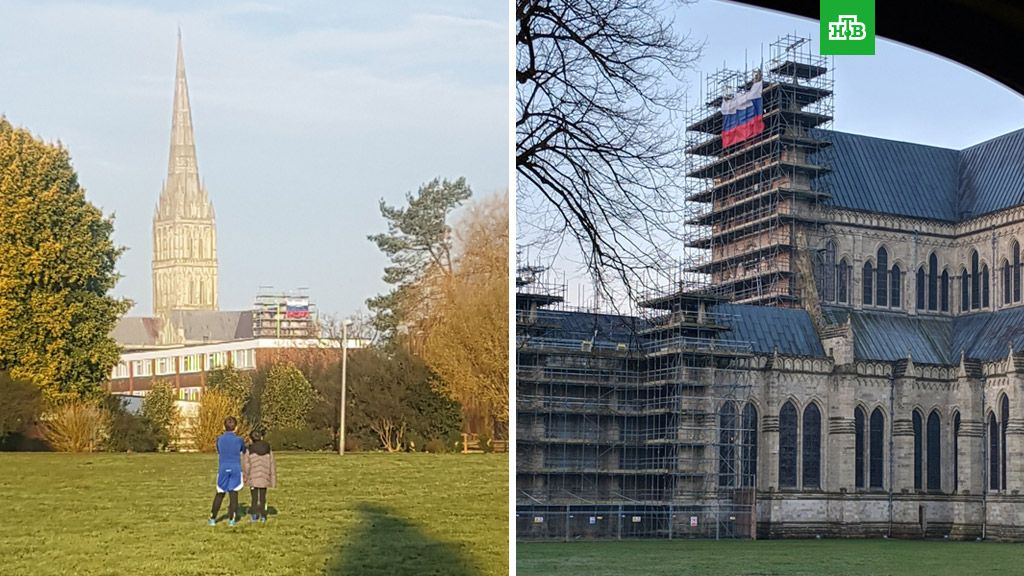 Огромный российский флаг появился сегодня утром на лесах у северной стены кафедрального собора британского города Солсбери, где год назад были отравлены Сергей Скрипаль и его дочь Юлия.