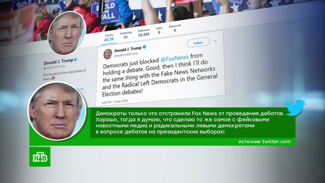 Американский лидер не уточнил, какие именно каналы он намерен бойкотировать. По словам Трампа, решение принял в ответ на действия своих политических оппонентов. «Демократы только что отстранили Fox News от проведения дебатов. Хорошо, тогда я думаю, что сделаю то же самое с лживыми новостными телекомпаниями и радикальными левыми демократами в вопросе дебатов на всеобщих выборах!» — написал глава Белого дома.