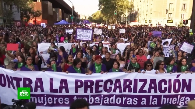 В Чили тысячи активисток вышли на марш в центре столицы. Кроме традиционных плакатов с лозунгами, участницы шествия захватили с собой барабаны и мегафоны.