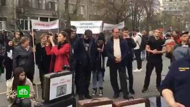 В итоге митингующие добрались до здания администрации президента. Причем не с пустыми руками — они принесли чемоданы для Порошенко и членов правительства с надписью «Чемодан — вокзал — тюрьма».