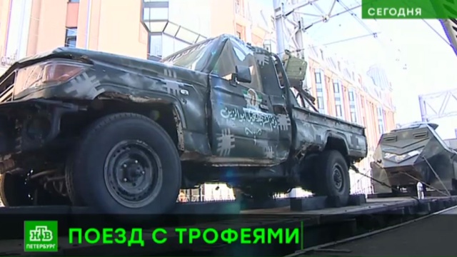 Поезд с трофеями пришел сегодня на Московский вокзал. Передвижную выставку под названием «Сирийский перелом» встречали с военными оркестрами и торжественным построением.