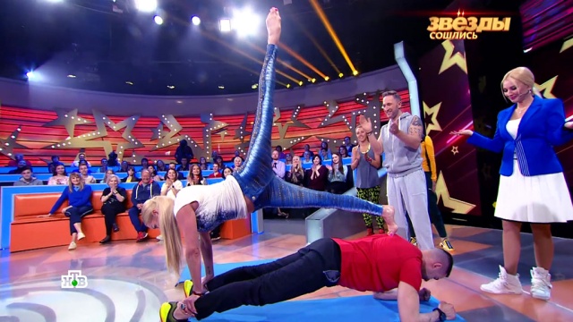 В танцевальной тренировке приняли участие множество звездных гостей. В их числе Анастасия Волочкова, которая внезапно упала. Но ее это не смутило и тренировка продолжилась. А при демонстрации упражнения «планка» Волочкова даже залезла тренеру на спину и почти показала шпагат.