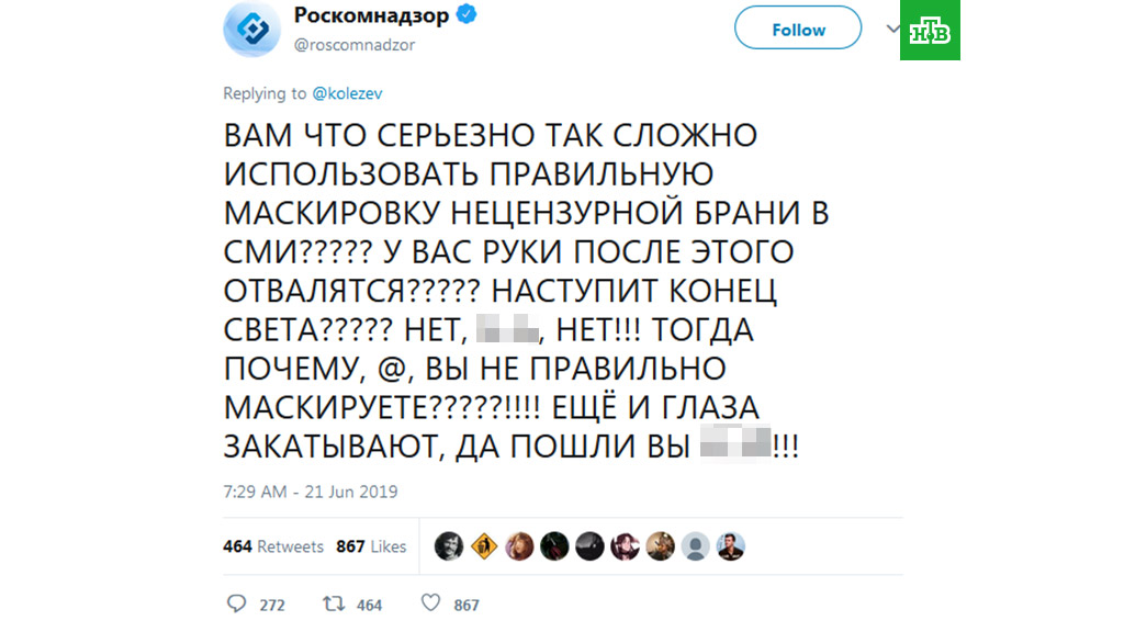 Сегодня же в стихийной акции поучаствовал Роскомнадзор. В ведомстве так ответили на правила маскировки мата в СМИ.