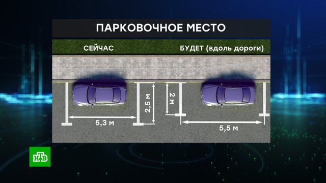 Сейчас место для легкового автомобиля должно быть минимум 5 метров 30 сантиметров в длину и 2,5 метра в ширину. Авторы инициативы хотят, чтобы габариты зависели от того, под каким углом к дороге находится парковка. Например, если вдоль, то она станет на полметра уже, а вот длина почти не изменится. Если же парковаться нужно под углом к проезжей части, то такие