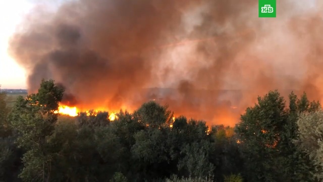 «Напоминает сцену из апокалипсиса», — пишет один из очевидцев в соцсетях. На кадрах видно, как стена из огня окружает заросшее камышом озеро.