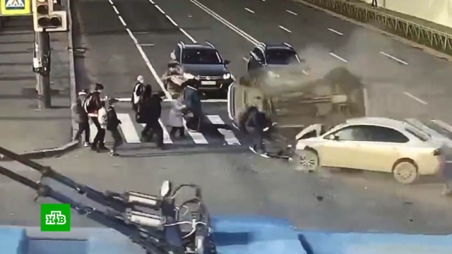 Авария произошла около полудня в среду. Серый седан Volkswagen Polo врезался в белый кроссовер Renault Kaptur, который от удара перевернулся. Оба автомобиля после столкновения сначала оказались на пешеходном переходе, по которому на зеленый сигнал светофора шли люди, затем Volkswagen выехал на тротуар.