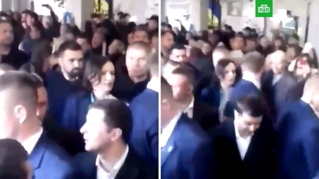 На размещенных в соцсетях видеозаписях видно, что охрана и соратники Зеленского быстро проводят его мимо протестующих, не давая ему возможности остановиться и вступить в диалог.