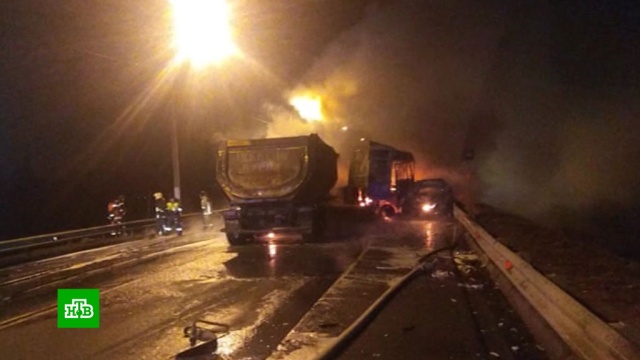 На участке, где велись работы по ремонту моста, водитель грузовика с прицепом не справился с управлением и протаранил пять автомобилей, стоявших на светофоре. От удара три машины загорелись, рассказали в ГИБДД.