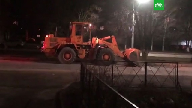 На кадрах грейдер медленно едет по сухой улице и загребает ковшом воздухом. Через несколько метров он останавливается и опрокидывает пустой ковш на обочину.