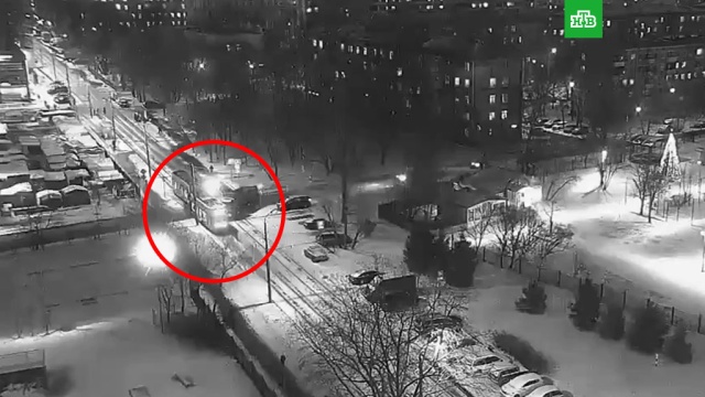 В Интернете появилось видео с трамваем, который сошел с рельсов после столкновения с грузовиком на севере Москвы.