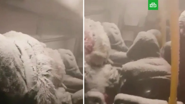 В Норильске пассажирский автобус попал в затор из-за аварии на трассе. На улице была сильная метель, и пассажиров больше получаса заметало снегом прямо в салоне.