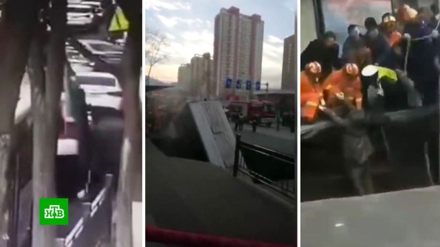 Автобус с пассажирами ушел под землю на остановке общественного транспорта в Китае.