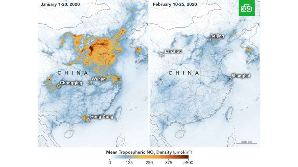 Уровень загрязнения воздуха в Китае заметно сократился. Снимки, сделанные НАСА, показывают разницу в содержании двуокиси азота в атмосфере.
