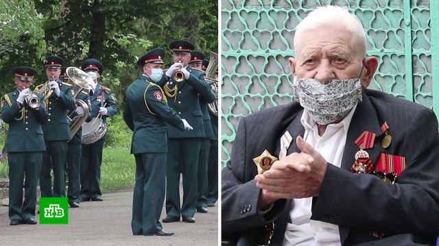 Индивидуальный парад Победы устроили сотрудники Росгвардии для ветеранов в Краснодаре. Во дворах их домов оркестр исполнил песни военных лет.