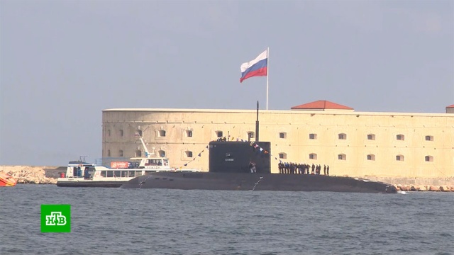 В Крыму, в Севастополе на воде в парадном строю стоят корабли Черноморского флота. Первая подводная лодка —