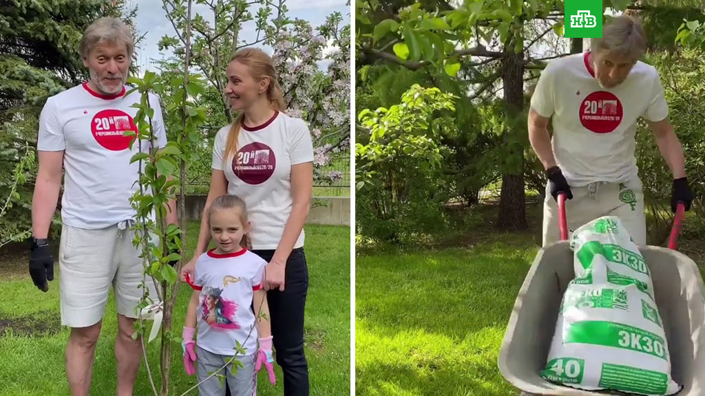 На ролике Дмитрий Песков, Татьяна Навка и их дочь Надя вместе сажают черешню в честь
