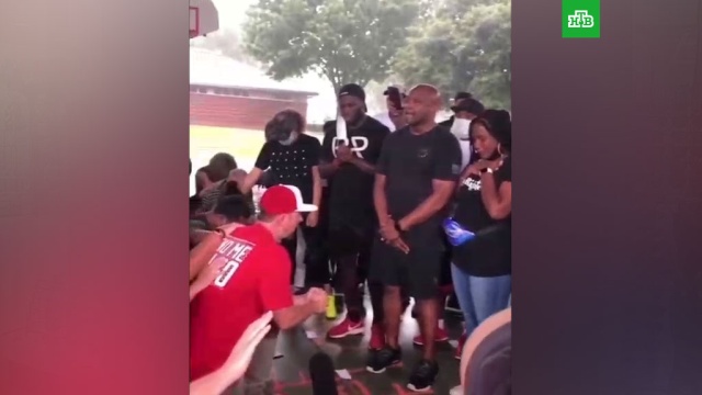 Событие произошло у церкви. Люди пришли туда помолиться за семью погибшего Джорджа Флойда, которая живет в этом городе. На кадрах видно, как люди разделились на два лагеря: белые активисты склонились перед группой темнокожих людей, один из них попросил прощения за годы унижений, которые пришлось пережить афроамериканцам. Темнокожая женщина расплакалась.
